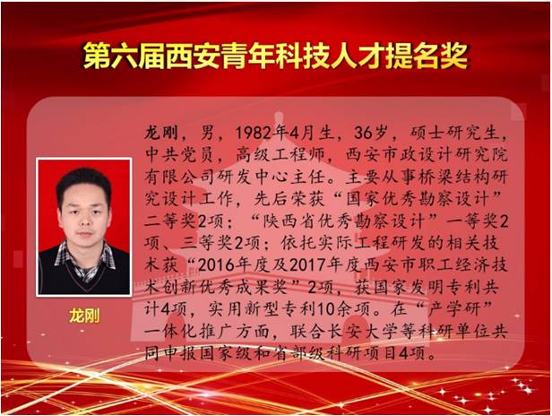 公司一人喜獲第六屆西安青年科技人才提名獎 近日,由市委組織部、市人力資源和社會保障局、市科協開展的第六屆西安青年科技人才獎評選表彰活動落下帷幕,我公司龍剛同志榮獲第六屆西安青年科技人才提名獎。