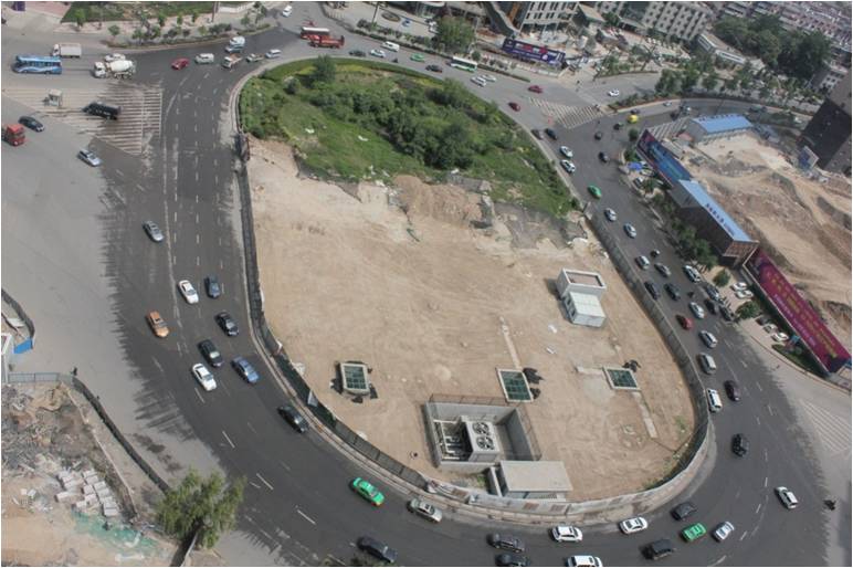 堡子村盤道位于長(zhǎng)樂(lè)東路、紡北路、電廠東路、紡西街、紡建路五條城市現(xiàn)狀道路的交叉口。改造前該盤道為地面單向四車道交通盤道,中心島周長(zhǎng)約380m,道路總用地約3.8ha,是城市現(xiàn)狀及現(xiàn)行紡織城分區(qū)規(guī)劃中的主要交通樞紐和城市空間節(jié)點(diǎn)。