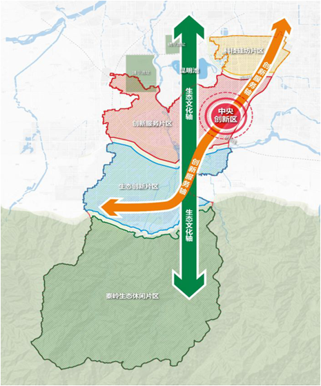 四片:建立四個功能復合、特色鮮明的發展區。包括科技硅坊片區、創新服務片區、生態創新片區、秦嶺生態休閑片區。