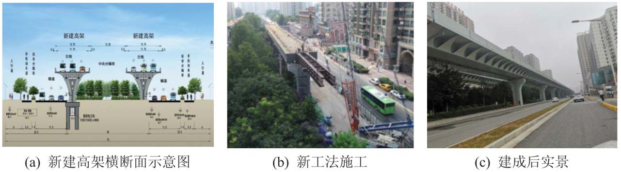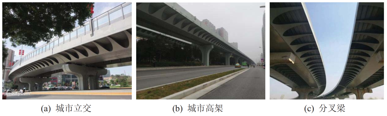 (1)上部結構創新及關鍵技術:發明了一種功能分區設計的部分敞口鋼梁,創新了城市鋼橋上部結構的主梁結構形式。提出的功能分區設計的部分敞口鋼梁,較常規鋼板(組合)梁或鋼箱(組合)梁造型更加美觀;鋼主梁結構體系主、次清晰,受力合理,其每平米用鋼量較常規鋼箱梁橋可節約15%~20%;主要受力構件和次要受力構件可視橋下實際情況同期或者分期施工,新工法對城市復雜交通環境的適應性更高,施工效率可以提高2~3倍。由于新型鋼梁自重輕、整體性強,施工工法適應性強,非常適用于城市各類鋼橋,尤其是高架橋和立交橋梁中的變寬梁和分叉梁。