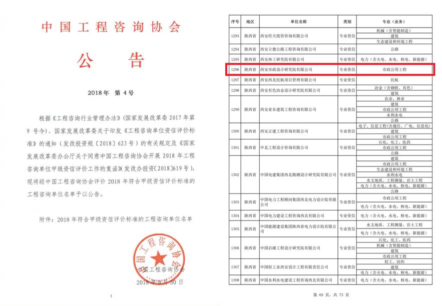 根據(jù)工程咨詢行業(yè)改革發(fā)展需要,國(guó)家發(fā)改委于2017年11月6日發(fā)布《工程咨詢行業(yè)管理辦法》取消對(duì)工程咨詢單位資格證書(shū)認(rèn)定,授權(quán)中國(guó)工程咨詢協(xié)會(huì)對(duì)工程咨詢單位開(kāi)展行業(yè)資信評(píng)價(jià),新資信評(píng)價(jià)工作于2018年展開(kāi)。我公司在原有國(guó)家發(fā)改委頒發(fā)的“工程咨詢單位甲級(jí)資質(zhì)(市政交通、給排水)”基礎(chǔ)上,依據(jù)自身實(shí)力及良好的業(yè)績(jī),積極開(kāi)展相關(guān)申報(bào)工作,于9月30日順利通過(guò)全國(guó)首批工程咨詢市政公用工程專業(yè)甲級(jí)資信,可承攬市政公用工程專業(yè)規(guī)劃咨詢、項(xiàng)目咨詢、評(píng)估咨詢、全過(guò)程咨詢等業(yè)務(wù)。
