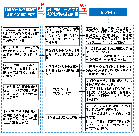城市橋梁建設受到地形、管線、既有交通、城市規劃方案等諸多限制,其景觀設計往往和橋梁結構的創新、優化緊密聯系在一起。項目團隊經十余年的研究,旨在分析和解決城市鋼橋景觀設計和施工過程中,由于結構造型日趨新穎、結構構造和受力日趨復雜、城市環境限制條件多樣等帶來的關鍵技術問題。