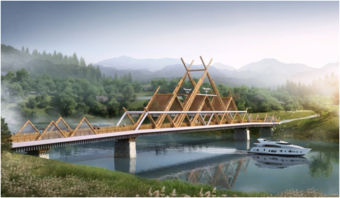 竹藝廊橋主體結構為三跨連續鋼箱梁橋。本方案以廣西毛南族花竹帽為原型,利用圓形和發散形的骨架,建成或大或小的草帽狀構筑物,點綴橋身,相映成趣。通過簡單優美的線條表現山水倒影,意象深遠。