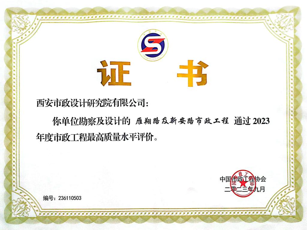 近日,中國(guó)市政工程協(xié)會(huì)頒發(fā)了2023年度市政工程最高質(zhì)量水平評(píng)價(jià)榮譽(yù)證書(shū),我公司勘察設(shè)計(jì)的“西安國(guó)際港務(wù)區(qū)柳新路(迎賓大道-港務(wù)西路)、向東路(迎賓大道-港務(wù)西路)道路和配套管線工程”、“雁翔路及新安路市政工程”獲此殊榮。